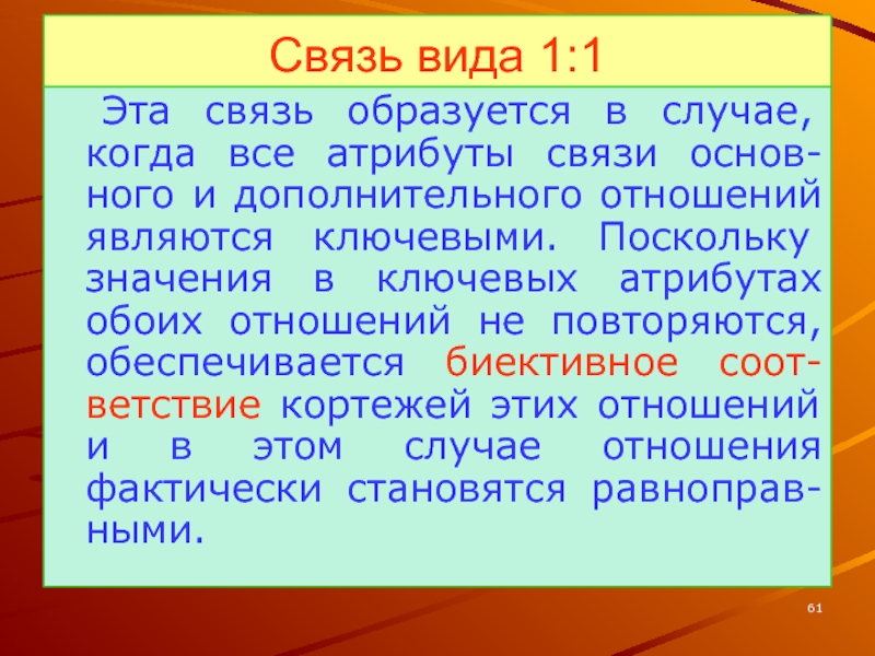 в ключевых атрибутах обоих отношений не повторяются, обеспечивается биективное соот-ветствие кортежей этих отношений и в этом случае отношения фактически становятся равноправ-ными.