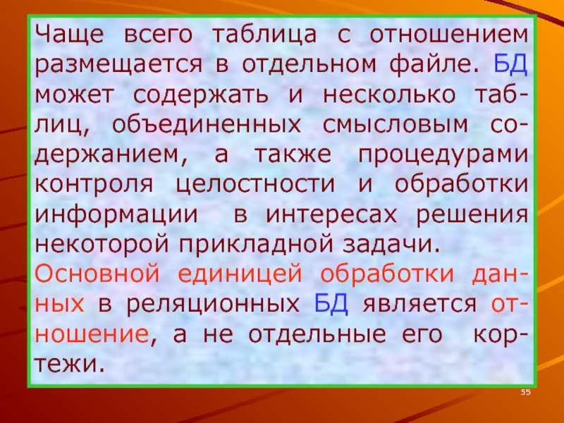 Слайд 55Чаще всего таблица с отношением размещается в отдельном файле. БД