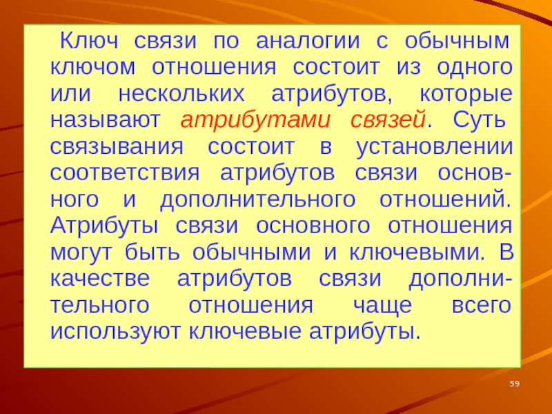 Слайд 59 Ключ связи по аналогии с обычным ключом отношения состоит
