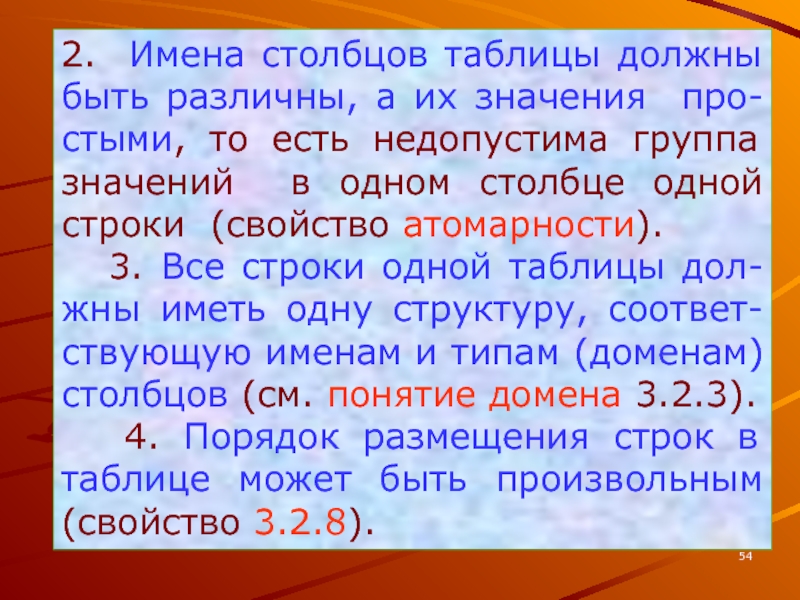 3. Все строки одной таблицы дол-жны иметь одну структуру, соответ-ствующую именам и типам (доменам) столбцов (см. понятие домена 3.2.3).