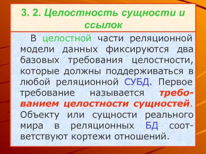 поддерживаться в любой реляционной СУБД. Первое требование называется требо-ванием целостности сущностей. Объекту или сущности реального мира в реляционных БД соот-ветствуют кортежи отношений.