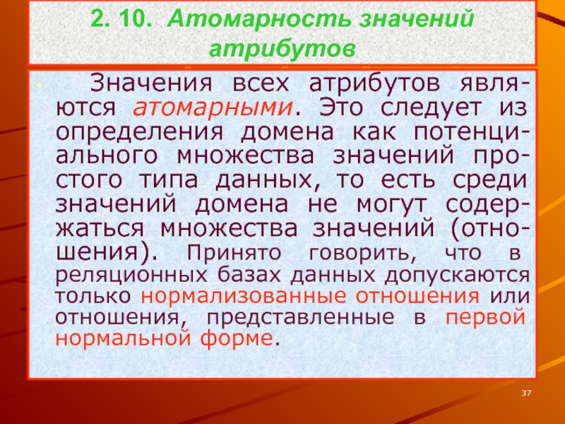 Слайд 47 Значение атрибута в любом кортеже отношения должно соответствовать