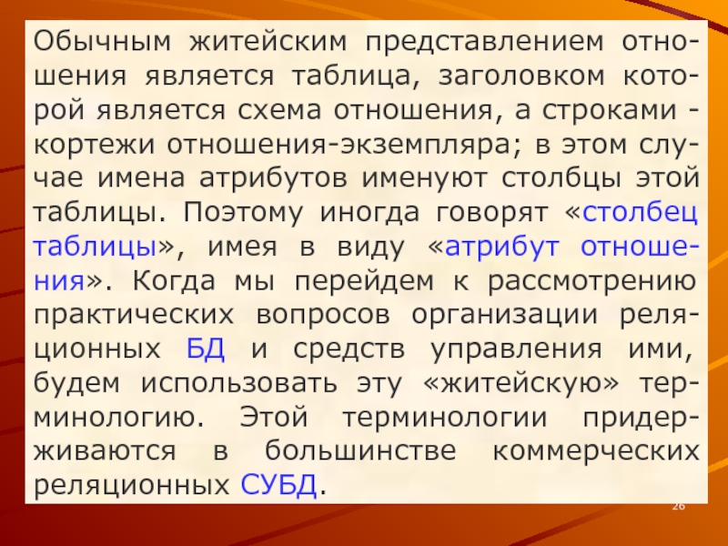 атрибутов именуют столбцы этой таблицы. Поэтому иногда говорят «столбец таблицы», имея в виду «атрибут отноше-ния». Когда мы перейдем к рассмотрению практических вопросов организации реля-ционных БД и средств управления ими, будем использовать эту «житейскую» тер-минологию. Этой терминологии придер-живаются в большинстве коммерческих реляционных СУБД.