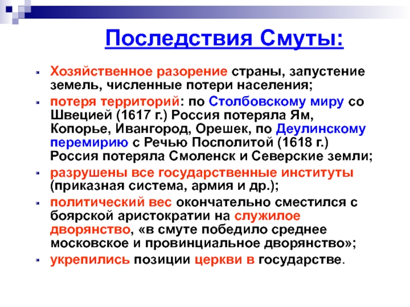 политический вес окончательно сместился с боярской аристократии на служилое дворянство, «в смуте победило среднее московское и провинциальное дворянство»;