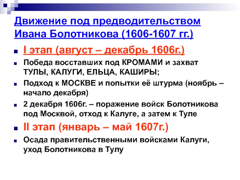 2 декабря 1606г. – поражение войск Болотникова под Москвой, отход к Калуге, а затем к Туле