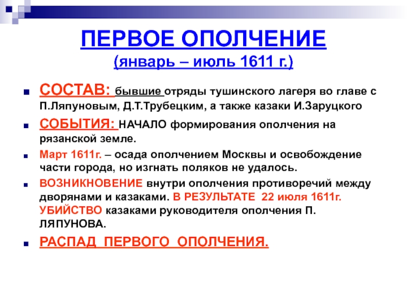 ВОЗНИКНОВЕНИЕ внутри ополчения противоречий между дворянами и казаками. В РЕЗУЛЬТАТЕ 22 июля 1611г. УБИЙСТВО казаками руководителя ополчения П.ЛЯПУНОВА.