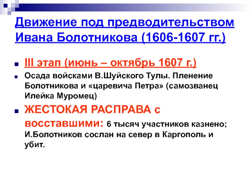 ЖЕСТОКАЯ РАСПРАВА с восставшими: 6 тысяч участников казнено; И.Болотников сослан на север в Каргополь и убит.