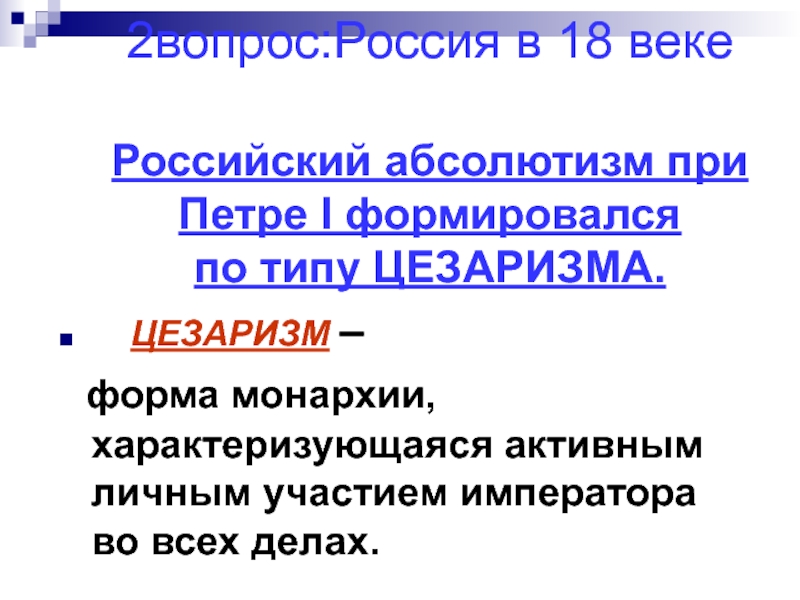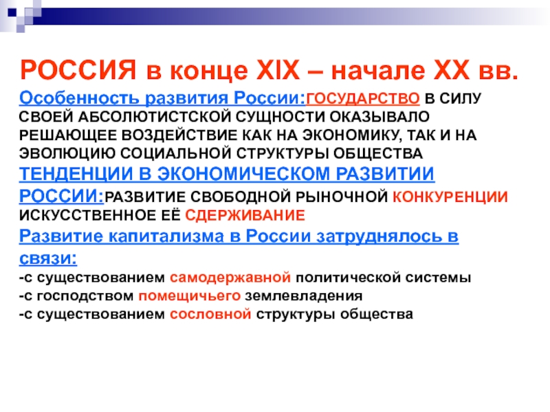Особенность развития России:ГОСУДАРСТВО В СИЛУ СВОЕЙ АБСОЛЮТИСТСКОЙ СУЩНОСТИ ОКАЗЫВАЛО РЕШАЮЩЕЕ ВОЗДЕЙСТВИЕ КАК НА ЭКОНОМИКУ, ТАК И НА ЭВОЛЮЦИЮ СОЦИАЛЬНОЙ СТРУКТУРЫ ОБЩЕСТВА