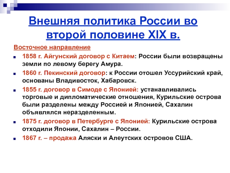 1855 г. договор в Симоде с Японией: устанавливались торговые и дипломатические отношения, Курильские острова были разделены между Россией и Японией, Сахалин объявлялся неразделенным.