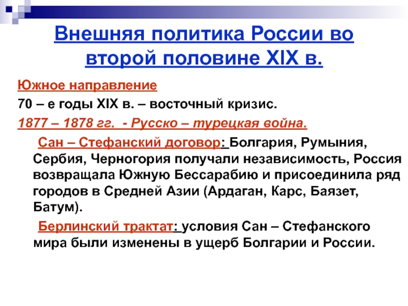 Сан – Стефанский договор: Болгария, Румыния, Сербия, Черногория получали независимость, Россия возвращала Южную Бессарабию и присоединила ряд городов в Средней Азии (Ардаган, Карс, Баязет, Батум).