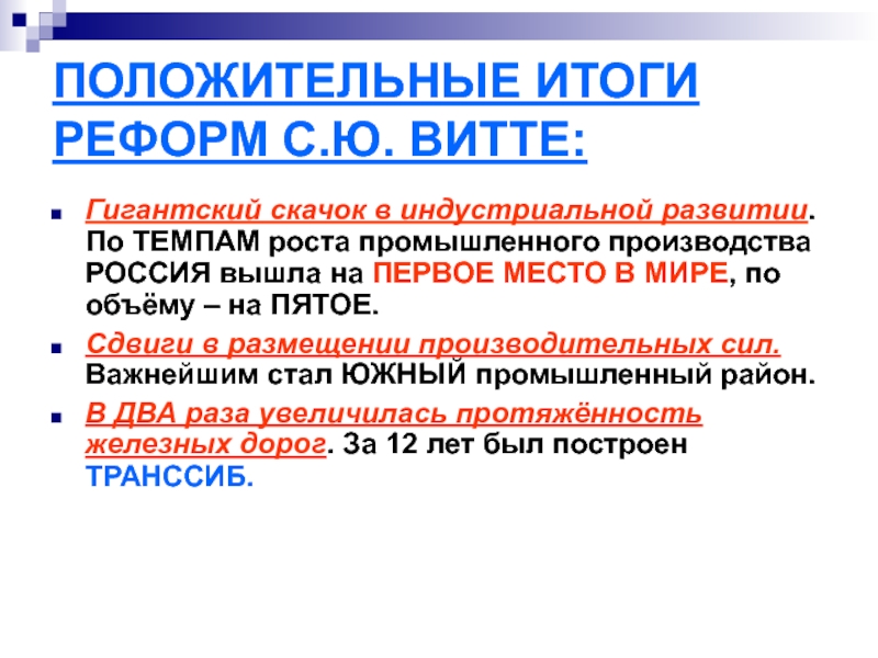 Слайд 119ПОЛОЖИТЕЛЬНЫЕ ИТОГИ РЕФОРМ С.Ю. ВИТТЕ: