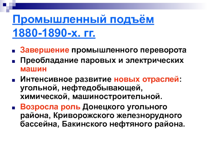 развитие новых отраслей: угольной, нефтедобывающей, химической, машиностроительной.