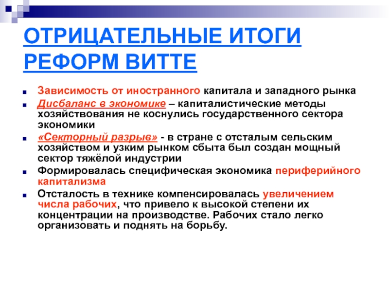 Слайд 120ОТРИЦАТЕЛЬНЫЕ ИТОГИ РЕФОРМ ВИТТЕ