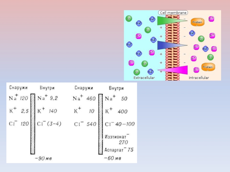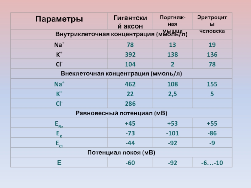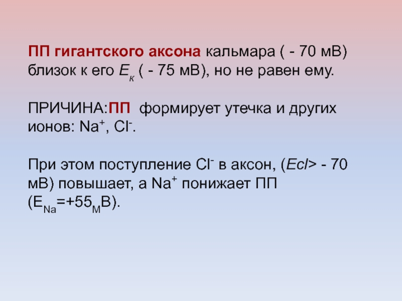 Слайд 46ПП гигантского аксона кальмара ( - 70 мВ) близок к
