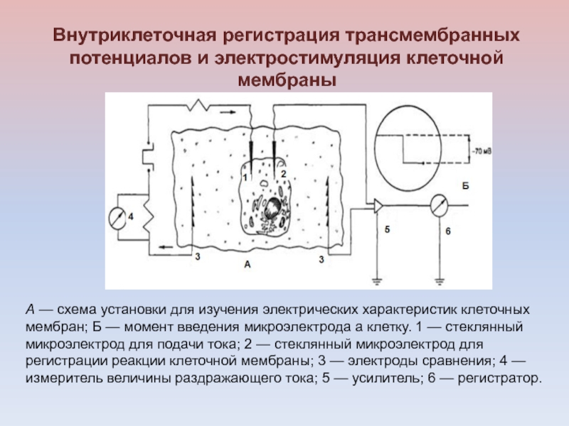 Слайд 53Схема регистрации мембранного потенциала клетки (А); мембранный потенциал клетки в
