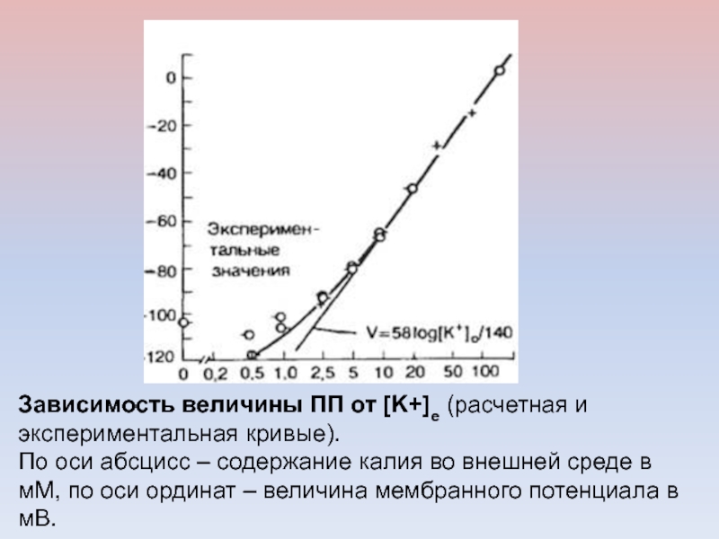 Слайд 40Зависимость величины ПП от [K+]е (расчетная и экспериментальная кривые).
