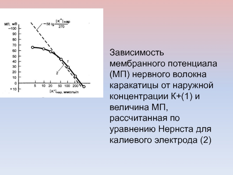 Слайд 39Зависимость мембранного потенциала (МП) нервного волокна каракатицы от наружной концентрации