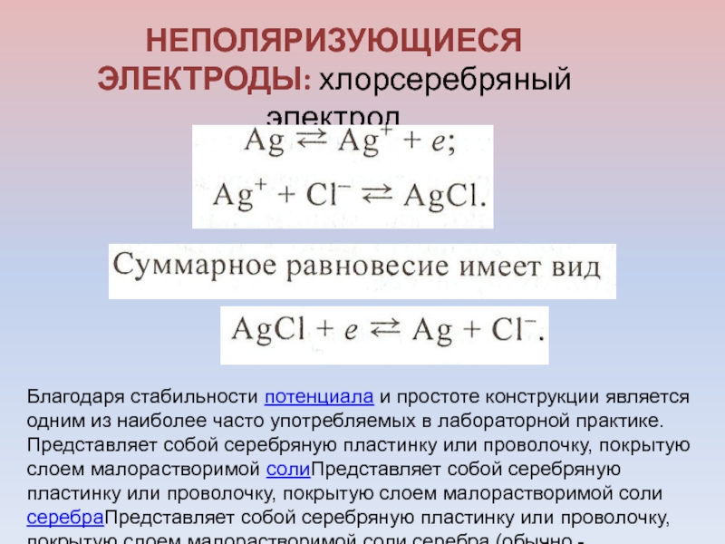 Слайд 16НЕПОЛЯРИЗУЮЩИЕСЯ ЭЛЕКТРОДЫ: хлорсеребряный электрод