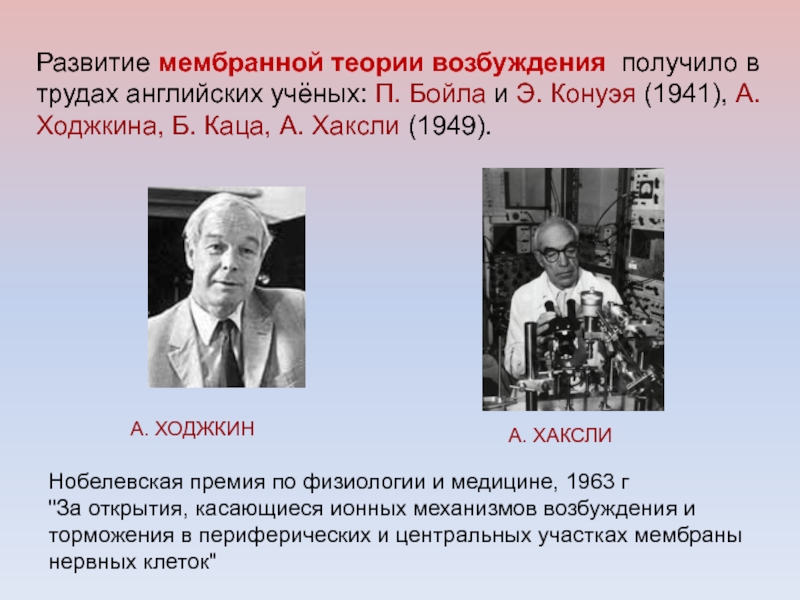 Слайд 30Развитие мембранной теории возбуждения получило в трудах английских учёных: П.