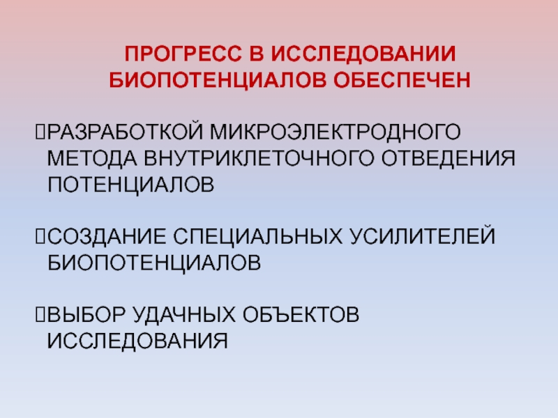 Слайд 12ПРОГРЕСС В ИССЛЕДОВАНИИ БИОПОТЕНЦИАЛОВ ОБЕСПЕЧЕН