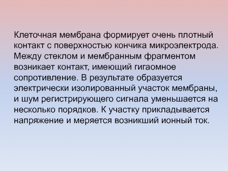 Слайд 24Клеточная мембрана формирует очень плотный контакт с поверхностью кончика микроэлектрода.