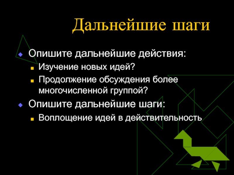 Дальнейшие шагиОпишите дальнейшие действия:Изучение новых идей?Продолжение обсуждения более многочисленной группой?Опишите дальнейшие шаги:Воплощение идей в действительность