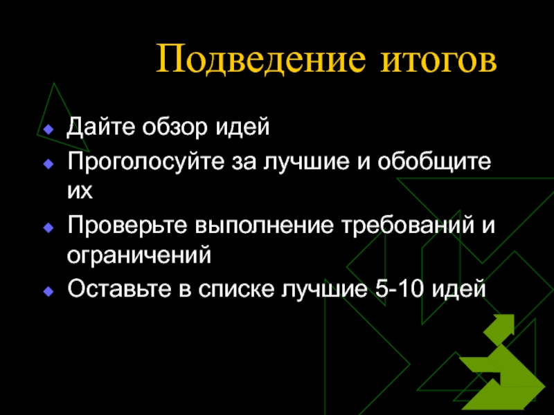 Подведение итоговДайте обзор идей Проголосуйте за лучшие и обобщите ихПроверьте выполнение требований и ограниченийОставьте в списке лучшие