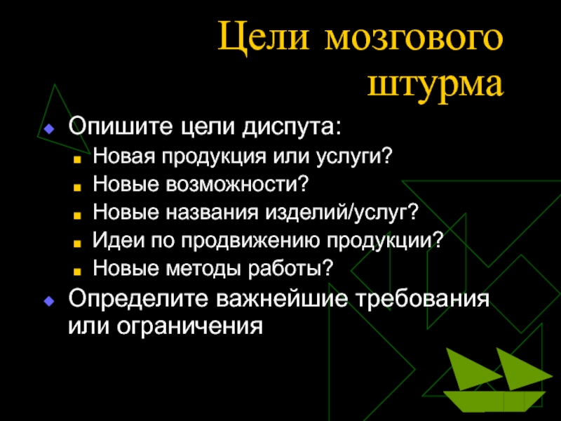 Цели мозгового штурмаОпишите цели диспута:Новая продукция или услуги?Новые возможности?Новые названия изделий/услуг?Идеи по продвижению продукции?Новые методы работы?Определите важнейшие