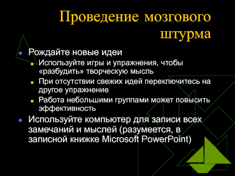Проведение мозгового штурмаРождайте новые идеиИспользуйте игры и упражнения, чтобы «разбудить» творческую мысльПри отсутствии свежих идей переключитесь на