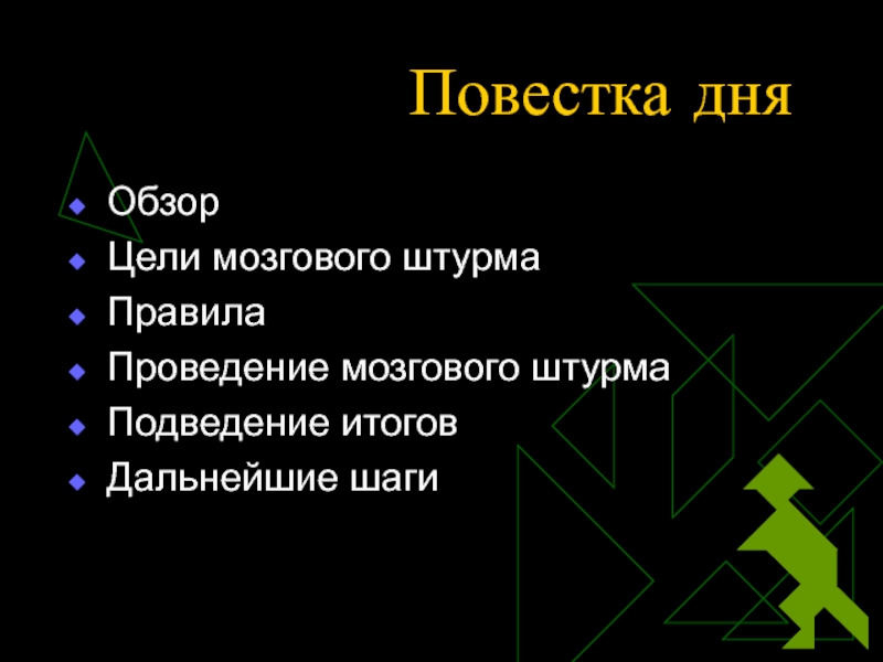 Повестка дняОбзорЦели мозгового штурмаПравилаПроведение мозгового штурмаПодведение итоговДальнейшие шаги