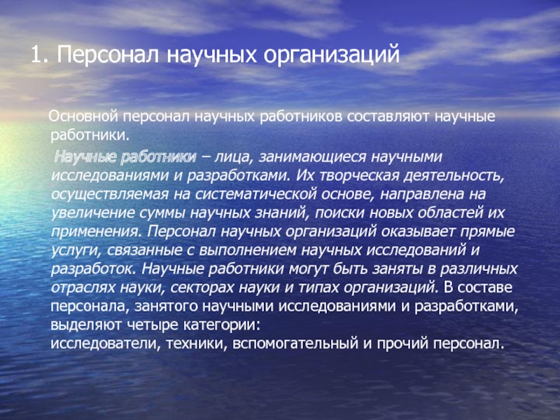 исследованиями и разработками. Их творческая деятельность, осуществляемая на систематической основе, направлена на увеличение суммы научных знаний, поиски новых областей их применения. Персонал научных организаций оказывает прямые услуги, связанные с выполнением научных исследований и разработок. Научные работники могут быть заняты в различных отраслях науки, секторах науки и типах организаций. В составе персонала, занятого научными исследованиями и разработками, выделяют четыре категории: