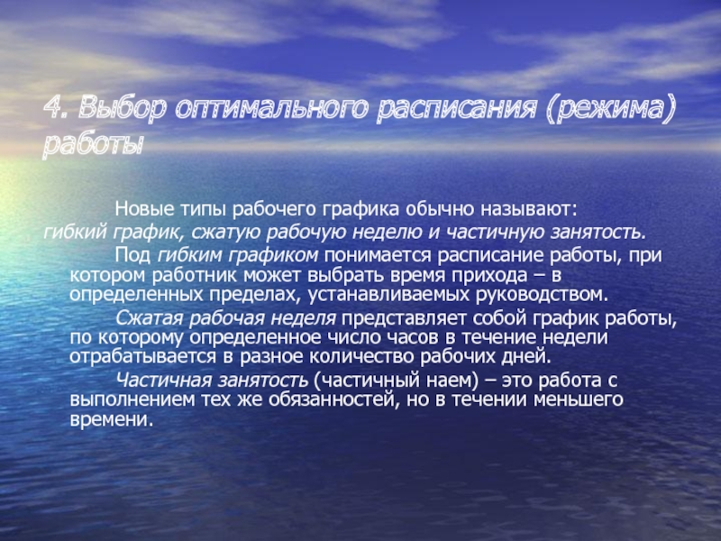 гибкий график, сжатую рабочую неделю и частичную занятость.