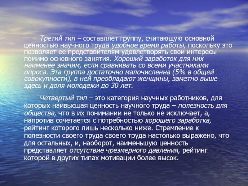 Четвертый тип – это категория научных работников, для которых наивысшая ценность научного труда – полезность для общества, что в их понимании не только не исключает, а, напротив сочетается с потребностью хорошего заработка, рейтинг которого лишь несколько ниже. Стремление к полезности своего труда своего труда настолько выражено, что для остальных, и, наоборот, наименьшую ценность представляет отсутствие чрезмерного давления, рейтинг которой в других типах мотивации более высок.