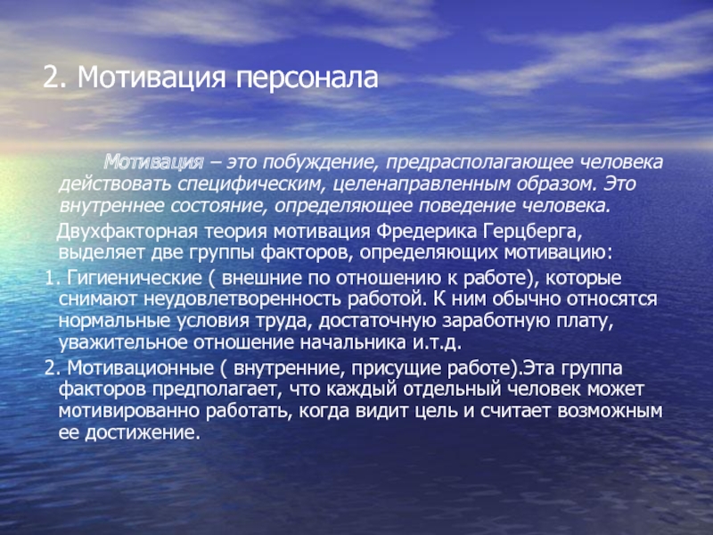 1. Гигиенические ( внешние по отношению к работе), которые снимают неудовлетворенность работой. К ним обычно относятся нормальные условия труда, достаточную заработную плату, уважительное отношение начальника и.т.д.