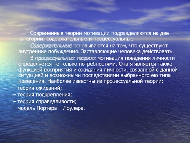 Слайд 10 Современные теории мотивации подразделяются на две категории: содержательные и процессуальные.