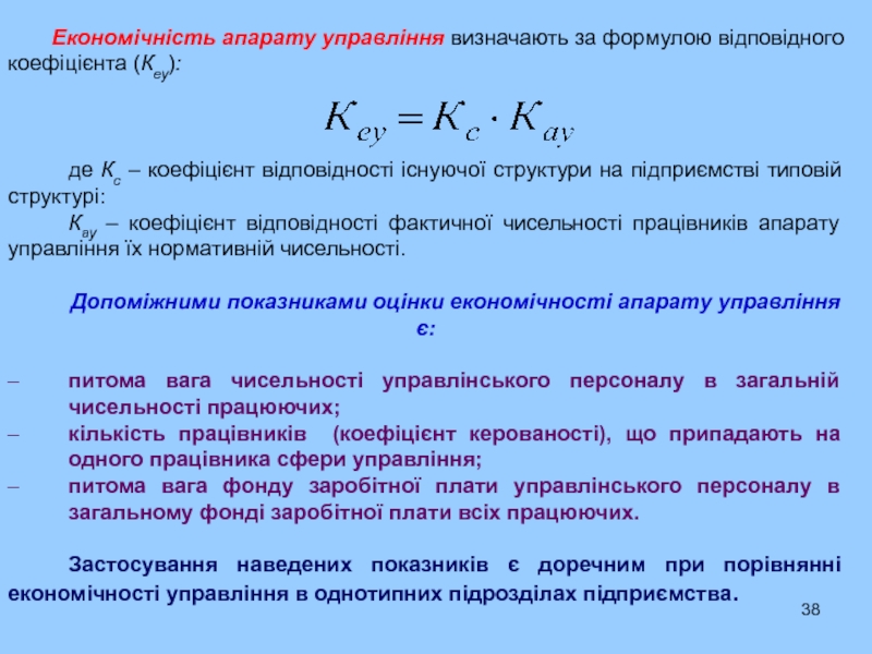 Слайд 38Економічність апарату управління визначають за формулою відповідного коефіцієнта (Кеу):