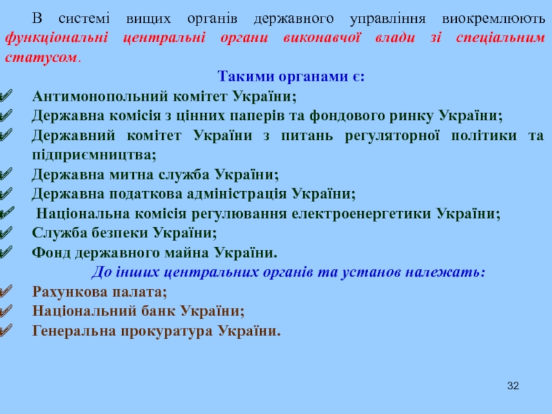 Слайд 32В системі вищих органів державного управління виокремлюють функціональні центральні органи