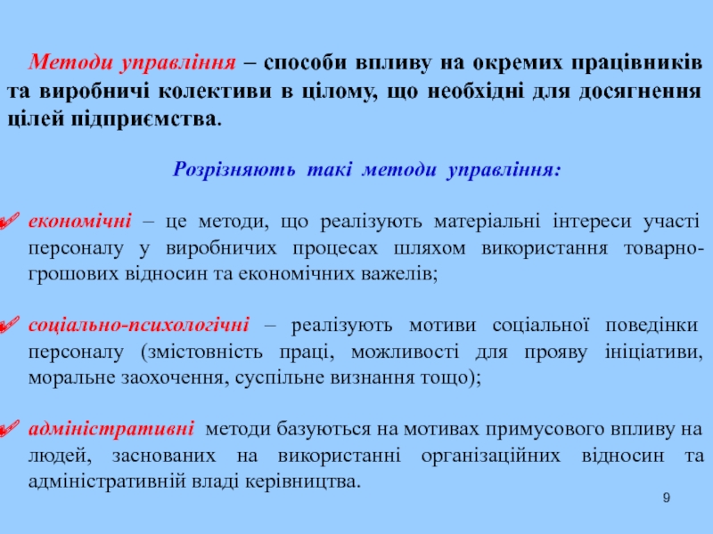 Слайд 9Методи управління – способи впливу на окремих працівників та виробничі
