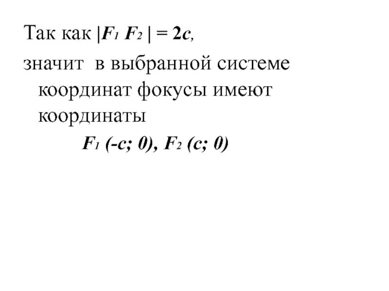 Так как |F1 F2 | = 2c, значит в выбранной системе координат фокусы имеют координаты