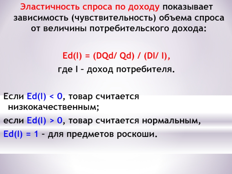 Слайд 56Эластичность спроса по доходу показывает зависимость (чувствительность) объема спроса от