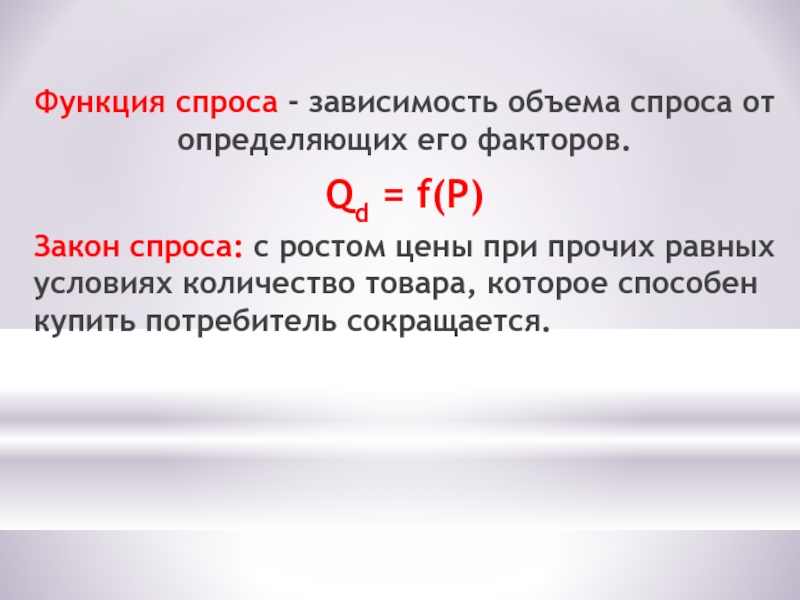 Слайд 15Функция спроса - зависимость объема спроса от определяющих его факторов.