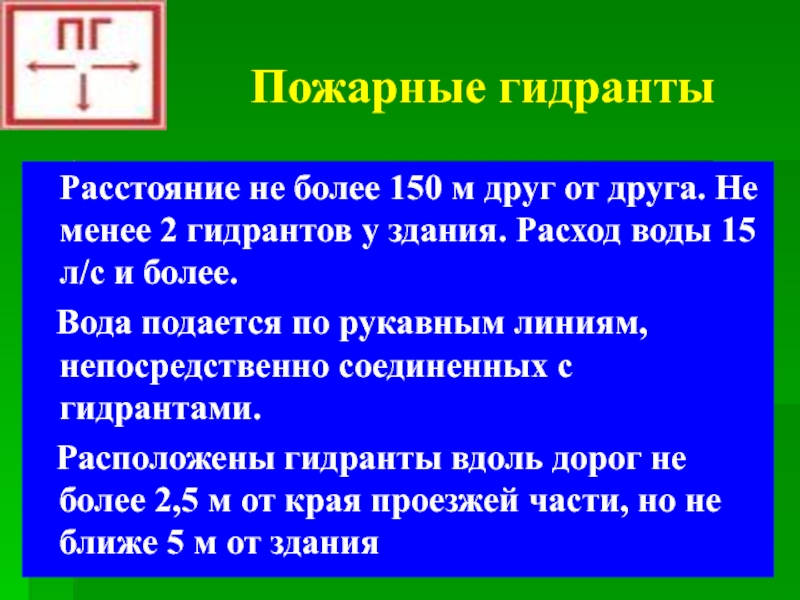 друга. Не менее 2 гидрантов у здания. Расход воды 15