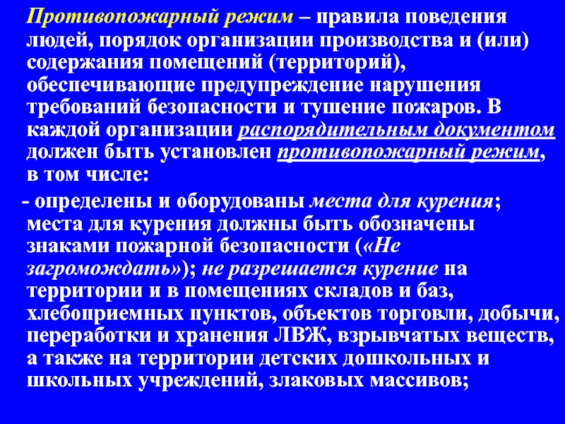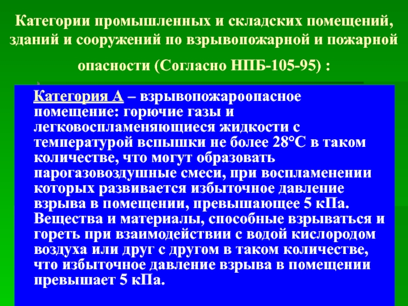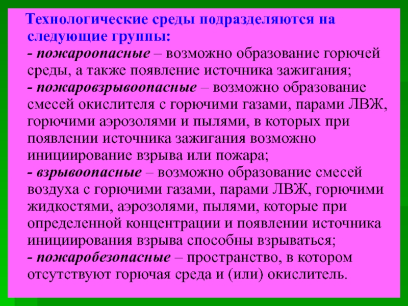 - пожароопасные – возможно образование горючей среды, а также появление источника зажигания; - пожаровзрывоопасные – возможно образование смесей окислителя с горючими газами, парами ЛВЖ, горючими аэрозолями и пылями, в которых при появлении источника зажигания возможно инициирование взрыва или пожара; - взрывоопасные – возможно образование смесей воздуха с горючими газами, парами ЛВЖ, горючими жидкостями, аэрозолями, пылями, которые при определенной концентрации и появлении источника инициирования взрыва способны взрываться; - пожаробезопасные – пространство, в котором отсутствуют горючая среда и (или) окислитель.