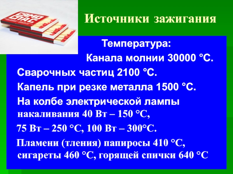 Пламени (тления) папиросы 410 °С, сигареты 460 °С, горящей спички 640 °С