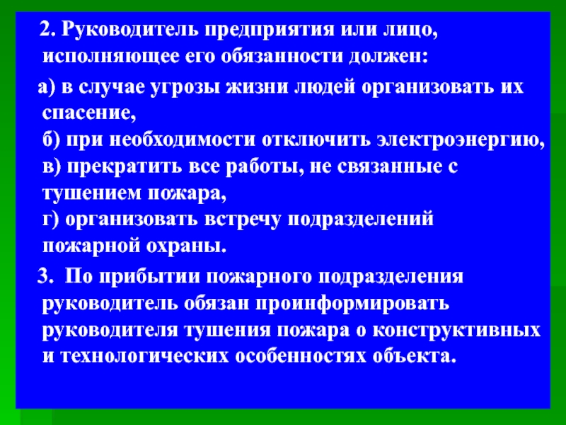 3. По прибытии пожарного подразделения руководитель обязан проинформировать руководителя тушения пожара о конструктивных и технологических особенностях объекта.