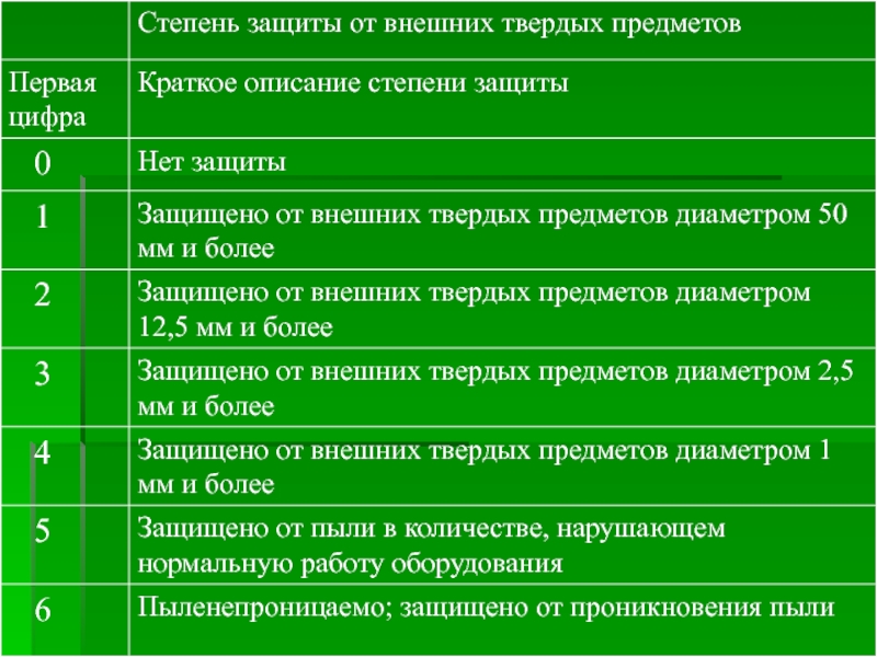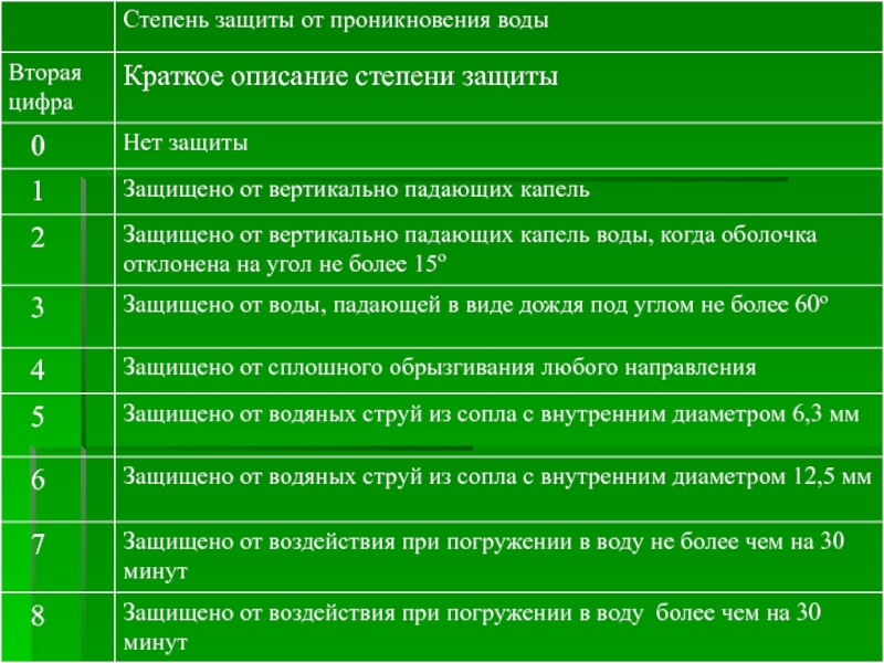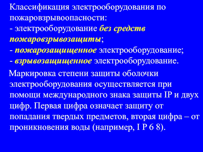 Маркировка степени защиты оболочки электрооборудования осуществляется при помощи международного знака защиты IP и двух цифр. Первая цифра означает защиту от попадания твердых предметов, вторая цифра – от проникновения воды (например, I P 6 8).
