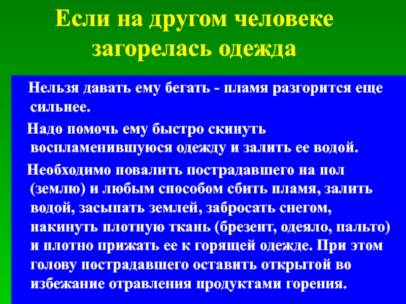 Необходимо повалить пострадавшего на пол (землю) и любым способом сбить пламя, залить водой, засыпать землей, забросать снегом, накинуть плотную ткань (брезент, одеяло, пальто) и плотно прижать ее к горящей одежде. При этом голову пострадавшего оставить открытой во избежание отравления продуктами горения.