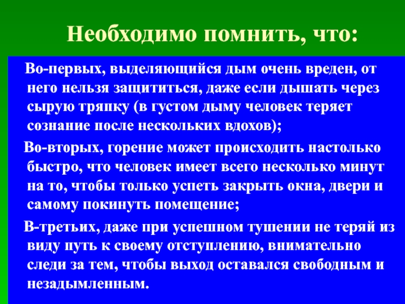 Во-вторых, горение может происходить настолько быстро, что человек имеет всего несколько минут на то, чтобы только успеть закрыть окна, двери и самому покинуть помещение;