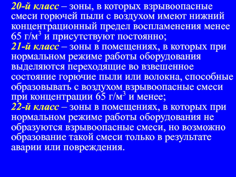 65 г/м3 и присутствуют постоянно; 21-й класс – зоны в помещениях, в которых при нормальном режиме работы оборудования выделяются переходящие во взвешенное состояние горючие пыли или волокна, способные образовывать с воздухом взрывоопасные смеси при концентрации 65 г/м3 и менее; 22-й класс – зоны в помещениях, в которых при нормальном режиме работы оборудования не образуются взрывоопасные смеси, но возможно образование такой смеси только в результате аварии или повреждения.