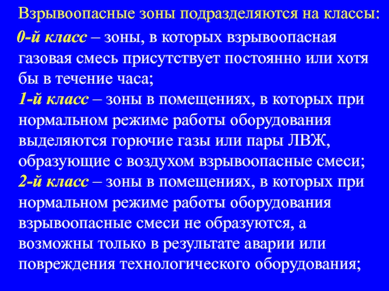 хотя бы в течение часа; 1-й класс – зоны в помещениях, в которых при нормальном режиме работы оборудования выделяются горючие газы или пары ЛВЖ, образующие с воздухом взрывоопасные смеси; 2-й класс – зоны в помещениях, в которых при нормальном режиме работы оборудования взрывоопасные смеси не образуются, а возможны только в результате аварии или повреждения технологического оборудования;